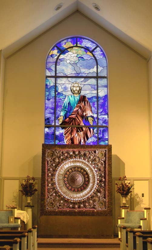 It is said that, “A picture paints a thousand words.” That being the case – which I have personally never disputed and have rather always agreed with – wish that I could come up with at least a thousand or more words to describe how I felt when I realized that The Natural Mandala was, in fact, going to be positioned in the place as it is pictured here. Not only is this a beautiful image that these two works of art create in their contrast of one another but as I have meditated on this image I begin to think about the symbolism that it ignites within me. The visual is a striking commentary that Jesus is in some way presenting, or offering The Natural Mandala to those who approach.