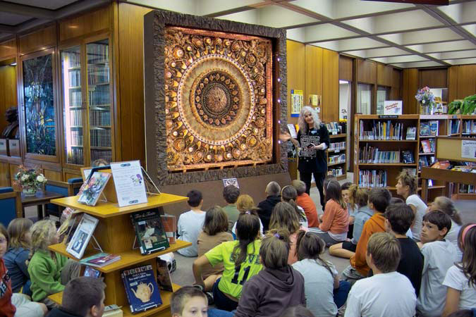 One of several important firsts for The Natural Mandala tour was the exhibit being used as an instrument for teaching. Certainly, one of the main purposes for which I created this work was to disseminate information about the mandala form. Another is to inspire a rediscovery of nature’s fecundity and instill a renewed appreciation for its form and architecture. Taking The Natural Mandala to various venues where diverse groups of people can see and experience it first hand is truly one of its most unique qualities, a true hallmark of its purpose and function. Rebecca Davies exemplified this function by bringing all of her fourth and fifth grade classes to see it over the course of several days. For me, it was an experience of wonderment to listen to the thoughts of these focused and well-trained young artists whose young minds have been masterfully challenged by Ms. Davies’ exceptional teaching skills and enduring enthusiasm. She is the quintessential unsung heroin, so supportive of others; she’s truly a gift to the art world.