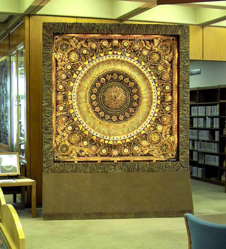 One of the reoccurring commentaries I received from library patrons was of their first experience seeing the mandala. Many spoke of the regal presence that The Natural Mandala possessed seen in the distance from the library entrance. As they approached the mandala they spoke about seeing many different things. Some had the impression that what they saw was made from copper while others thought it was a quilted pattern but most agreed that it took them by surprise to see that it was indeed rendered completely with organic material and that the image was not flat but very sculptural and deeply three dimensional.