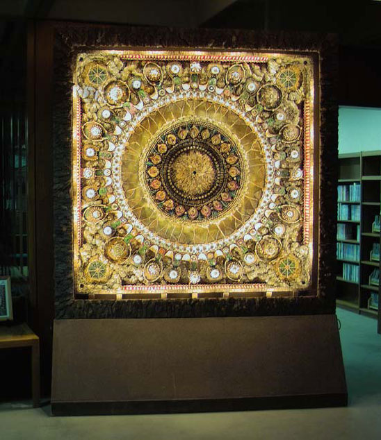 Another first for me was to see The Natural Mandala in its frame, on its pedestal and illuminated solely by its own internal lighting system. It is a really different look than what you see when there are other extraneous lights working upon it as well. A feature that I wanted to incorporate into the frame is the four panels of lights with five lights within each panel. Each of these is on separate dimmer switch so that each side, top and bottom can be adjusted for any lighting condition. When the mandala is being used specifically for meditation, it helps to have the room lights dimmed for ambiance, and thus, having the internal lights becomes a more appropriate and important quality. Photographically, this image doesn’t work all that well, but in person, under this lighting condition, the Natural Mandala glows like copper.